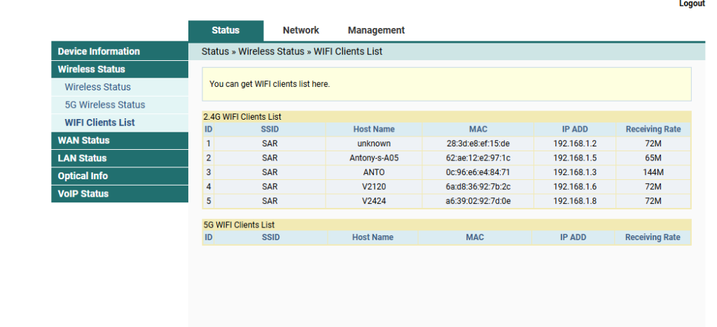 • Check on top at the tab labeled Status. Under Status, there is Wireless User Status; below it is the WIFI Clients List.